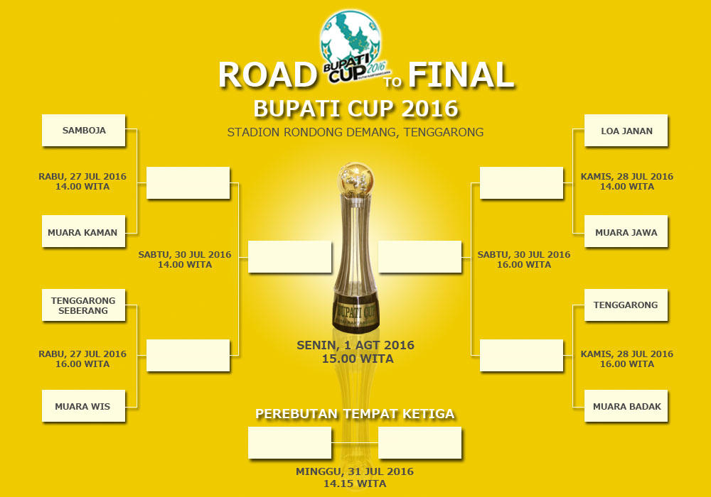 "Kemudian tim yang kalah di semifinal akan memperebutkan posisi ketiga pada hari Minggu 31 Juli 2016. Sedangkan tim yang lolos ke final akan bertarung pada Senin 1 Agustus 2016. Seluruh pertandingan tetap digelar di Stadion Rondong Demang, mulai 8 besar hingga final," pungkasnya.