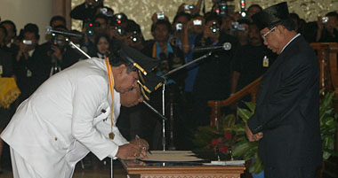Gubernur Kaltim Suwarna AF ketika melantik H Syaukani HR dan H Samsuri Aspar sebagai Bupati dan Wakil Bupati Kukar periode 2005-2010 Photo: Jaya
