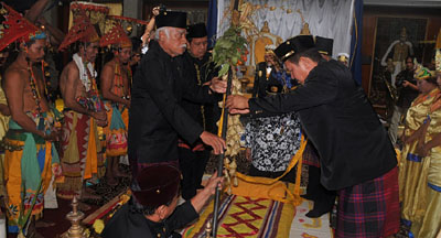 Seorang Dewa melakukan ritual tepong tawar terhadap Sultan Kutai HAM Salehoeddin II Photo: Humas Kukar/Heru Abdi | | |