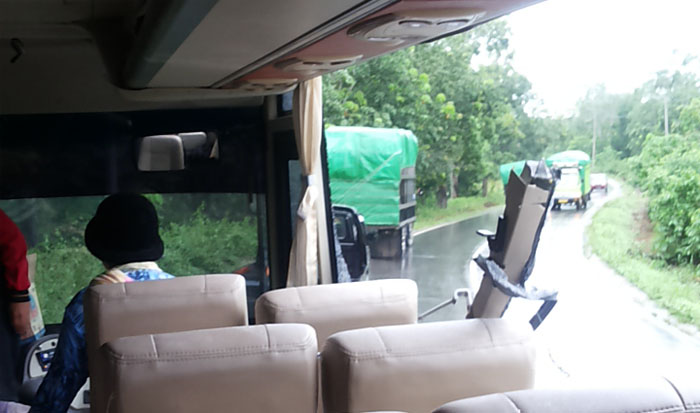 Bus warna kuning nopol KT 7005 UW yang bergerak menuju Kutai Timur ini berserempetan dengan truk pengangkut tabung elpiji yang datang dari arah berlawanan saat kedua kendaraan berpapasan di sebuah jalanan menikung yang masih basah akibat guyuran hujan.