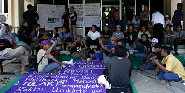 Spanduk besar yang dibentangkan pengunjukrasa FMUD ini lah yang sempat diturunkan mahasiswa Kelas Khusus FKIP Photo: Yanda | | |