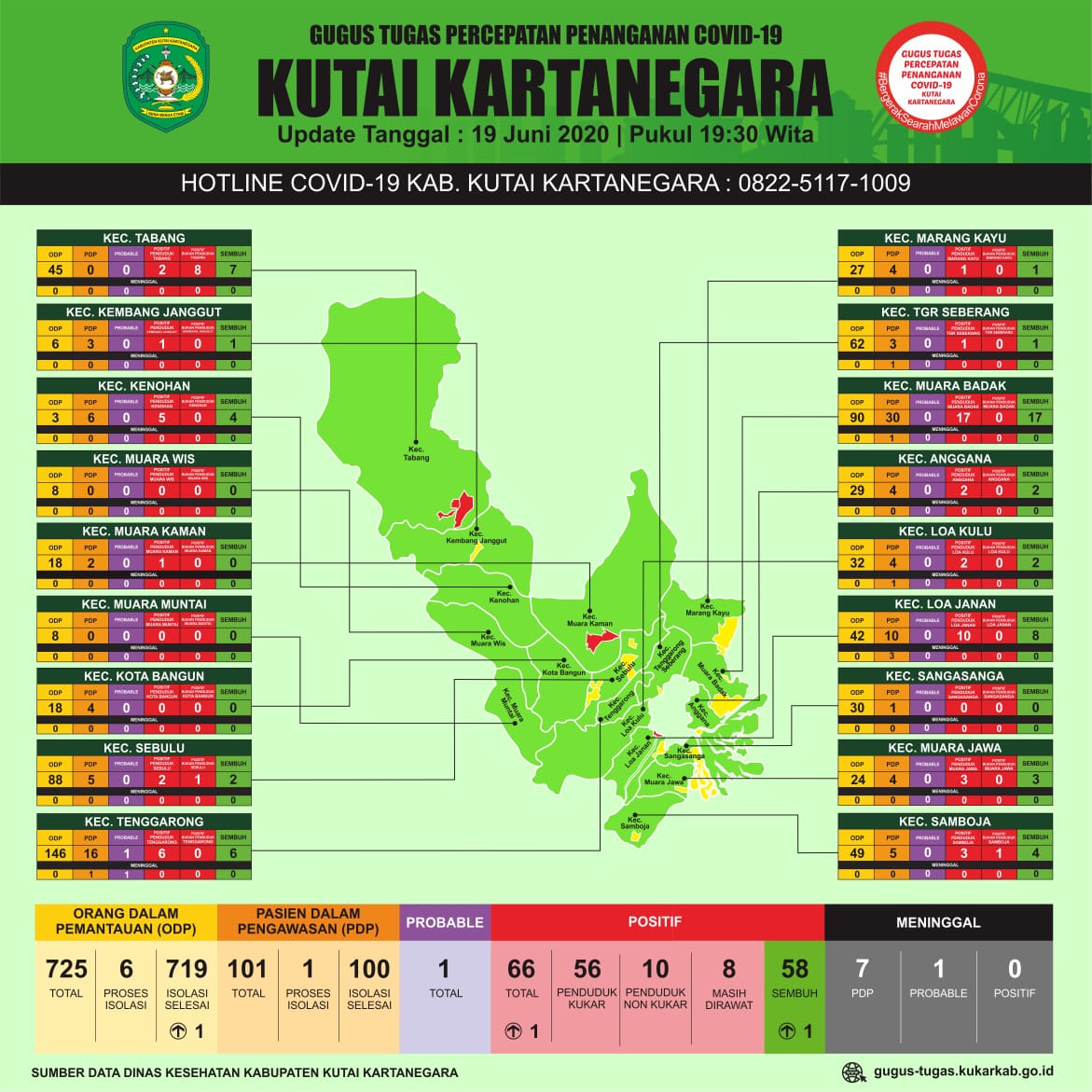 Seperti yang dirilis Dinas Kesehatan Kukar per hari Jum'at 19 Juni 2020, terjadi penambahan sebanyak 1 kasus terkonfirmasi positif COVID-19 dari kecamatan Sebulu.