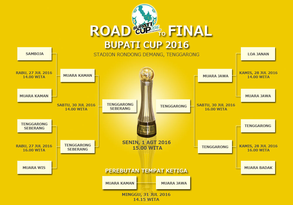 Tim tuan rumah Tenggarong berhasil mengamankan tiket ke partai final Bupati Cup 2016 setelah mengandaskan tim Kecamatan Muara Jawa pada laga semifinal di Stadion Rondong Demang, Tenggarong, Sabtu (31/07) sore.