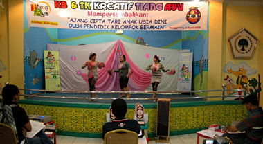 Para pendidik dari sejumlah Kelombok Bermain (KB) tadi siang ikut ambil bagian dalam ajang Cipta Tari Anak Usia Dini se-Kutai Kartanegara (Kukar) yang berlangsung di KB Tiang Ayu, Tenggarong.