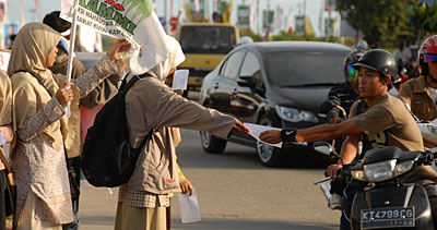 Para aktivis yang tergabung dalam AAPP membagi-bagikan selebaran kepada para pengguna jalan Photo: Agri