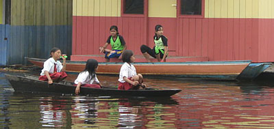 Dua orang siswa SDN 003 Muara Kaman Ilir tampak asyik bermain perahu kecil Photo: Buyung Marajo | | |