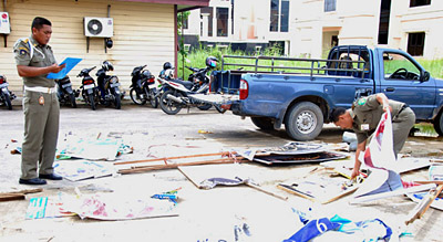 Ditambahkannya, alat peraga yang dipasang sembarangan dan kemudian ditertibkan anggotanya itu adalah yang tertempel di batang-batang pohon penghijauan pinggir jalan, di puncak atau di atas pohon, tiang listrik, bundaran jalan dan jembatan serta yang melintas di tengah jalan.