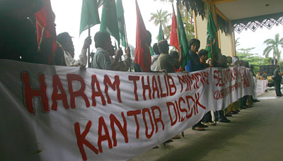 Pengunjukrasa membentangkan sejumlah spanduk yang berisi protes terhadap pengangkatan Abdul Thalib