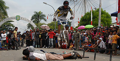 Seperti yang tampak dalam Pawai Pembangunan sepanjang siang tadi, sejumlah pelajar Sekolah Menengah Atas (SMA) menampilkan aksi teatrikal layaknya tim Detasemen Khusus (Densus) 88 Anti Teror yang tengah menumpah teroris.