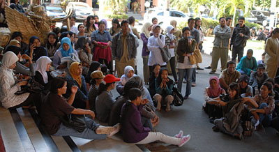 Ratusan pengunjukrasa akhirnya memilih tetap bertahan sambil duduk-duduk di teras serta halaman Kantor Bupati Kukar sambil menanti penjelasan dari pejabat terkait.