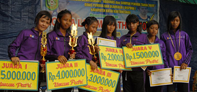 Selain memperoleh trofi dan piagam penghargaan, baik Juara I Umum Putra maupun Putri berhak memperoleh uang tunai sebesar Rp 5 juta. Sedangkan Juara II dan Juara III masing-masing berhak memperoleh uang tunai Rp 4 juta dan 3 juta.