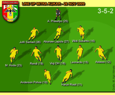 Sedangkan di barisan belakang ditempati Jufri Samad, kapten tim Abunaw Cletus Lapula dan Widi Susanto, serta kiper Agung Prasetyo sebagai palang pintu Mitra Kukar.