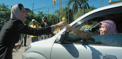 Aksi tunggalnya ini mendapat sambutan antusias dari para pengguna jalan yang sempat menerima bunga langsung dari tangan Rita Widyasari.