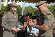 Sebelum upacara dimulai, Plt Kepala Satpol PP Kukar Fida Hurasani menyerahkan cenderamata berupa sebuah sangkur kepada Bupati Kukar Rita Widyasari. (win/man)
