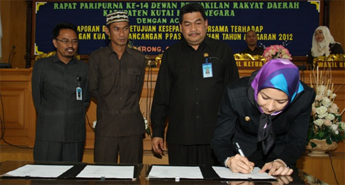 Hal tersebut dituangkan dalam nota kesepakatan bersama tentang Kebijakan Umum Anggaran dan Plafon Priotitas Anggaran Sementara (KUA-PPAS) Perubahan 2012 yang ditandatangani Bupati Rita Widyasari bersama unsur Pimpinan DPRD Kukar di Tenggarong.