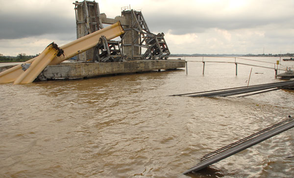 Kondisi reruntuhan Jembatan Kartanegara setelah pylon tanpa sengaja roboh sendiri, Minggu (25/11) siang Photo: Agri