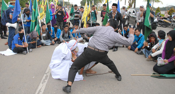 Karena tak diizinkan memasuki gedung DPRD Kukar, para pengunjukrasa akhirnya memilih untuk duduk membentuk lingkaran di tengah jalan. Mereka kemudian melakukan aksi teatrikal yang menggambarkan penderitaan rakyat serta aparat hukum yang melindungi anggota dewan bermasalah.