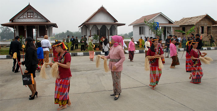 Sekkab Kukar Edi Damansyah (kedua dari kanan) bersama Kepala Disbudpar Kukar dan pejabat FKPD merasakan kehidupan masyarakat Kutai di salah satu replika rumah Festival Kampong Kutai Photo: Agri