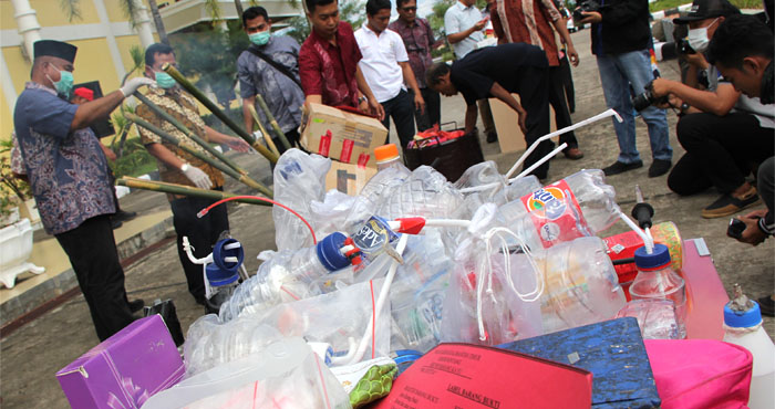 Kemudian untuk barang bukti berupa butiran sabu dan pil LL dimusnahkan dengan cara dilarutkan dalam air. Sedangkan barang bukti lainnya seperti ganja, obat tanpa izin edar, bong dimusnahkan dengan cara dibakar.