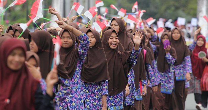 Pelajar SMA IT Nurul Ilmi Tenggarong mengusung miniatur Ka'bah dalam barisan pawai mereka Photo: Agri