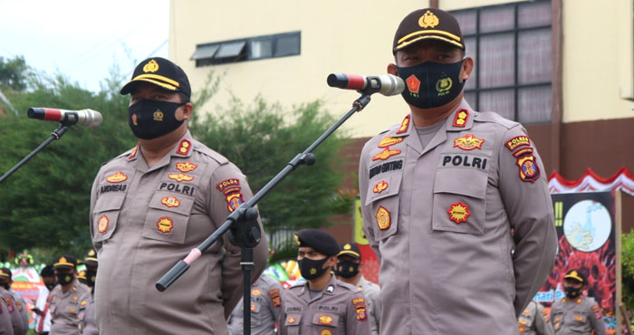 Kapolres Irwan M Ginting dan pejabat lama Andrias Susanto kemudian tampil di atas podium untuk mengikuti rangkaian upacara penyambutan pejabat baru dan pelepasan pejabat lama Kapolres Kukar yang dilaksanakan dengan menerapkan protokol kesehatan pencegahan COVID-19.